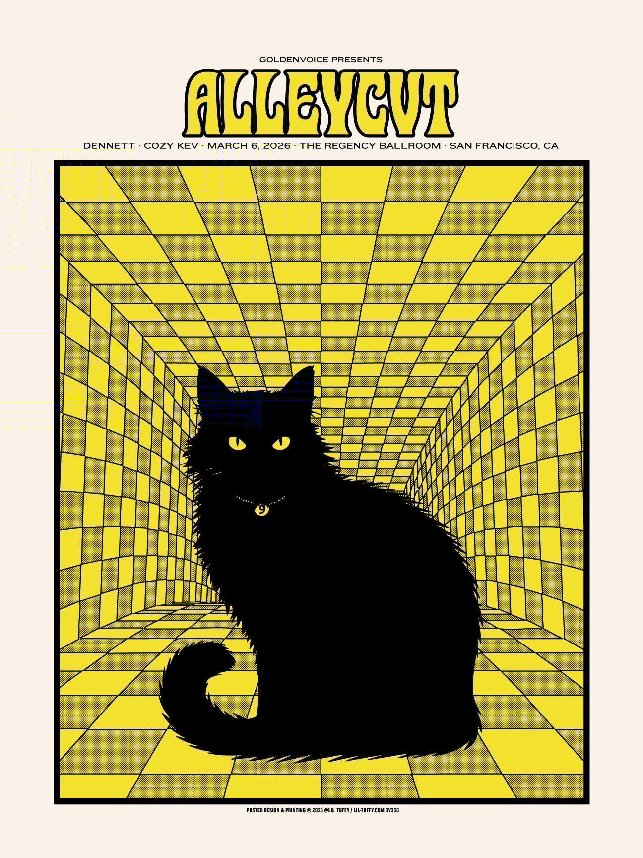ALLEYCVT · Dennett · Cozy Kev The Regency Ballroom · Match 6, 2026 · San Francisco Client: Goldenvoice Dimensions: 18" x 24" · Edition: 200 · Colors: 2