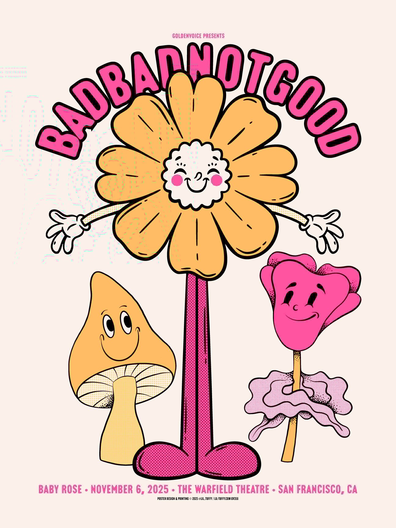 Badbadnotgood · Baby Rose The Warfield Theatre · Oct 24, 2025 · San Francisco Client: Goldenvoice Dimensions: 18" x 24" · Edition: 200 · Colors: 3