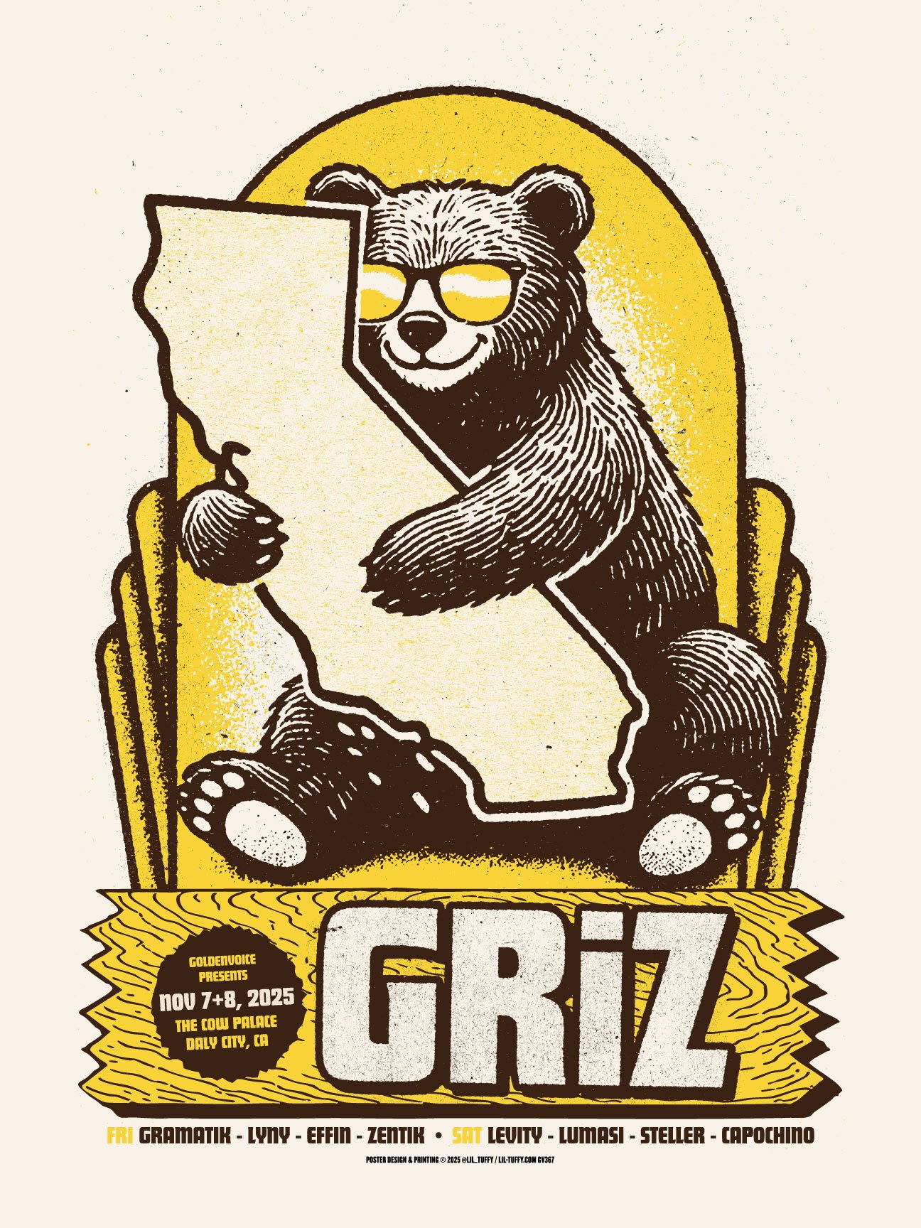GRiZ · Grammatix · Lyny · Effin · Zenith · Levity · Lumasi · Stellar · Capuchin The Cow Palace · Nov 7 & 8, 2025 · Daly City Client: Goldenvoice Dimensions: 18" x 24" · Edition: 200 · Colors: 2