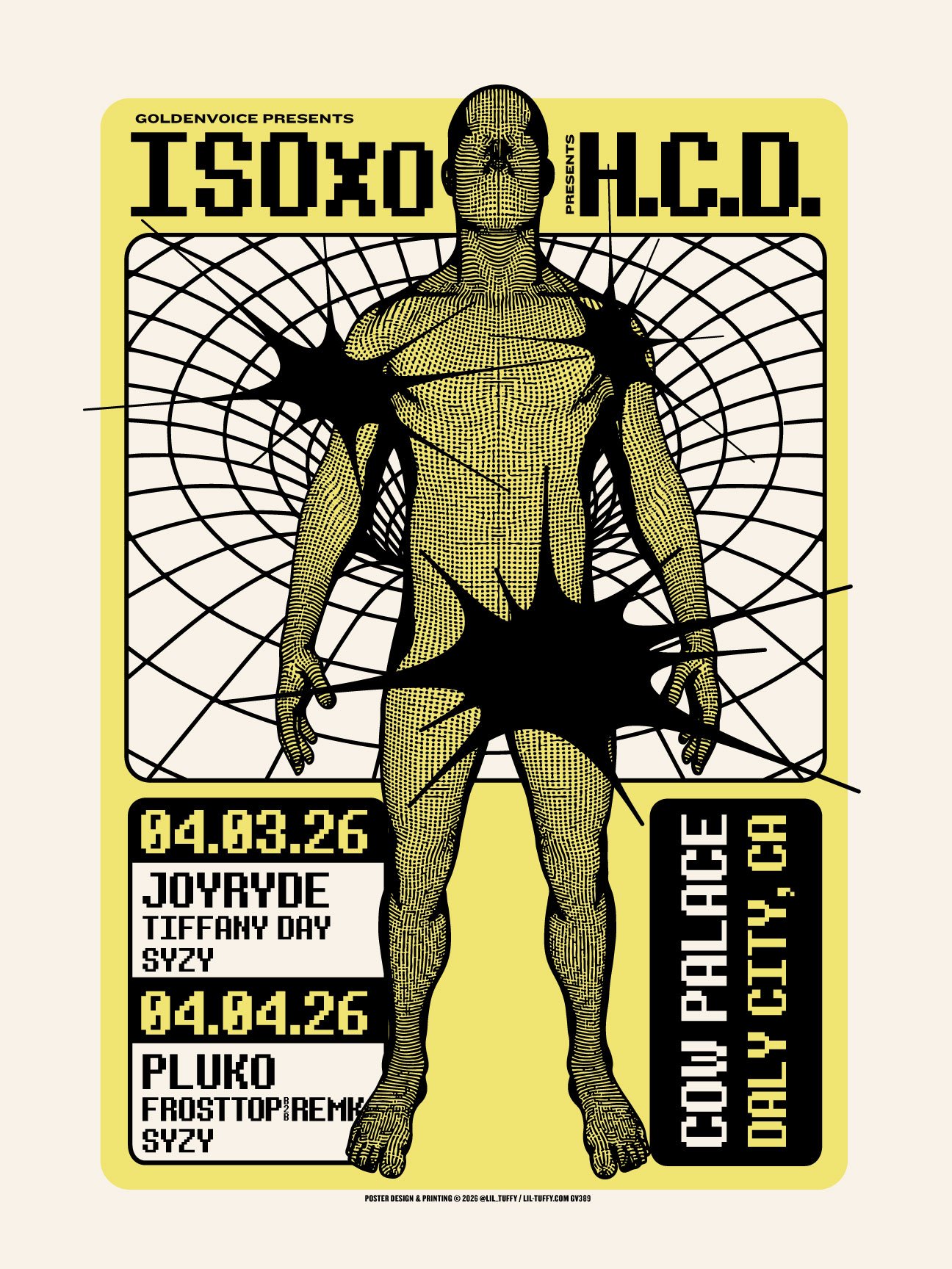 ISOxo · Joyride ·Tiffany Day · SYZY · Pluko · Frosttop b2b Remk Cow Palace · April 3 & 4, 2026 · Daly City Client: Goldenvoice Dimensions: 18" x 24" · Edition: 200 · Colors: 2