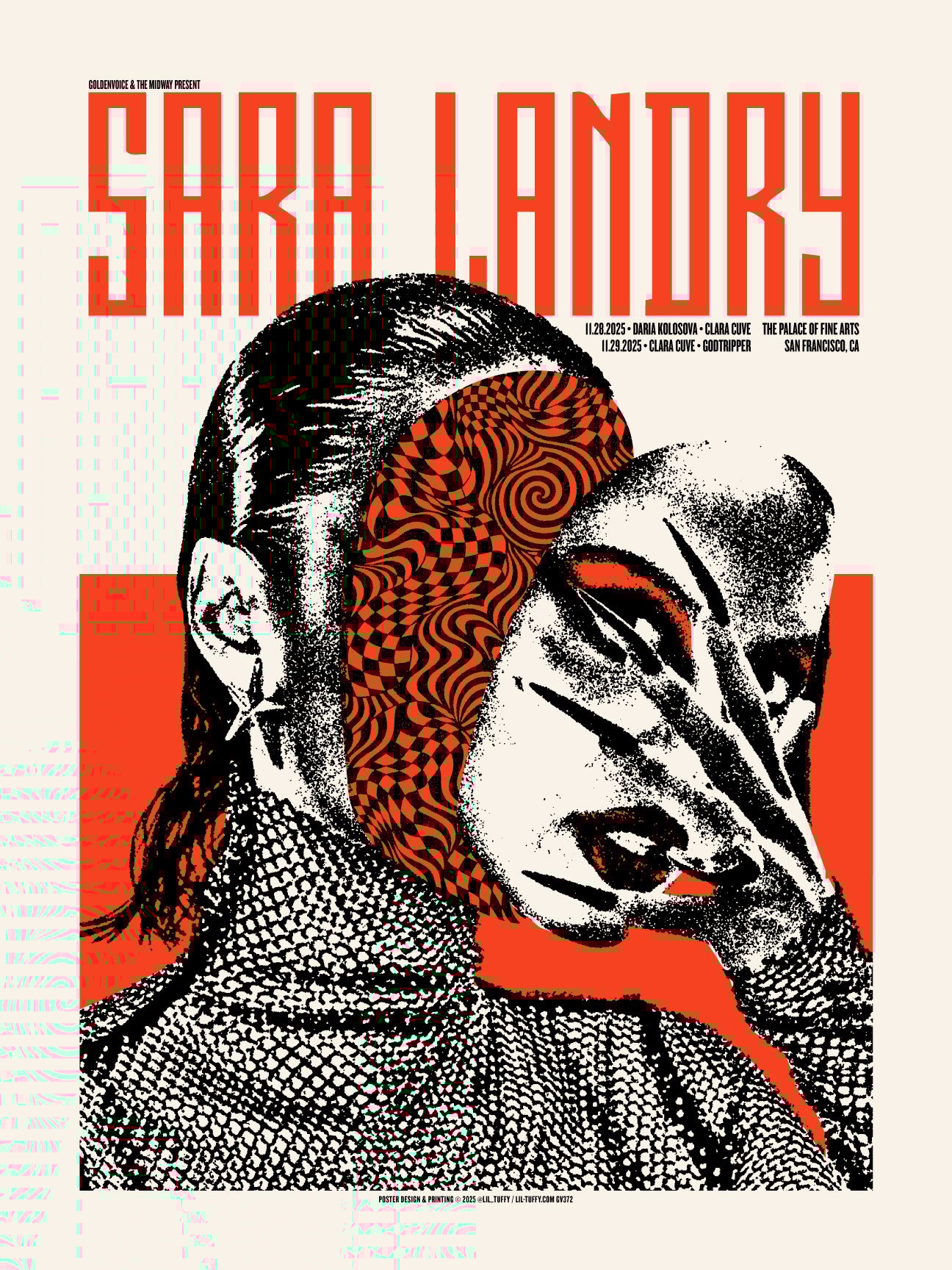 Sara Landry · Diara Kolosova · Clara Cuve · Gootripper Palace of Fine Arts · Nov 28 & 29, 2025 · San Francisco Client: Goldenvoice Dimensions: 18" x 24" · Edition: 200 · Colors: 2